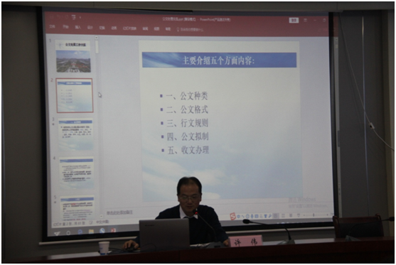 為進(jìn)一步提升公司員工公文寫作和處理能力,促進(jìn)公司公文處理工作實(shí)現(xiàn)規(guī)范化、標(biāo)準(zhǔn)化。11月22日,在公司12樓會議室組織開展了公文處理專題培訓(xùn),集團(tuán)公司全體干部職工、子公司主要負(fù)責(zé)人60余人參加了培訓(xùn)。培訓(xùn)邀請市政府辦副調(diào)研員許偉同志進(jìn)行授課。