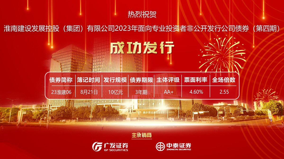 8月21日,淮南建設(shè)發(fā)展控股(集團(tuán))有限公司2023年第四期非公開(kāi)發(fā)行公司債成功簿記發(fā)行,發(fā)行規(guī)模10億元,全場(chǎng)認(rèn)購(gòu)倍數(shù)2.55倍,票面發(fā)行利率4.6%。